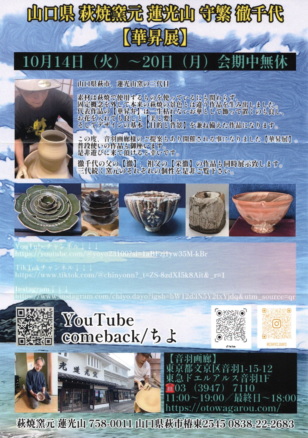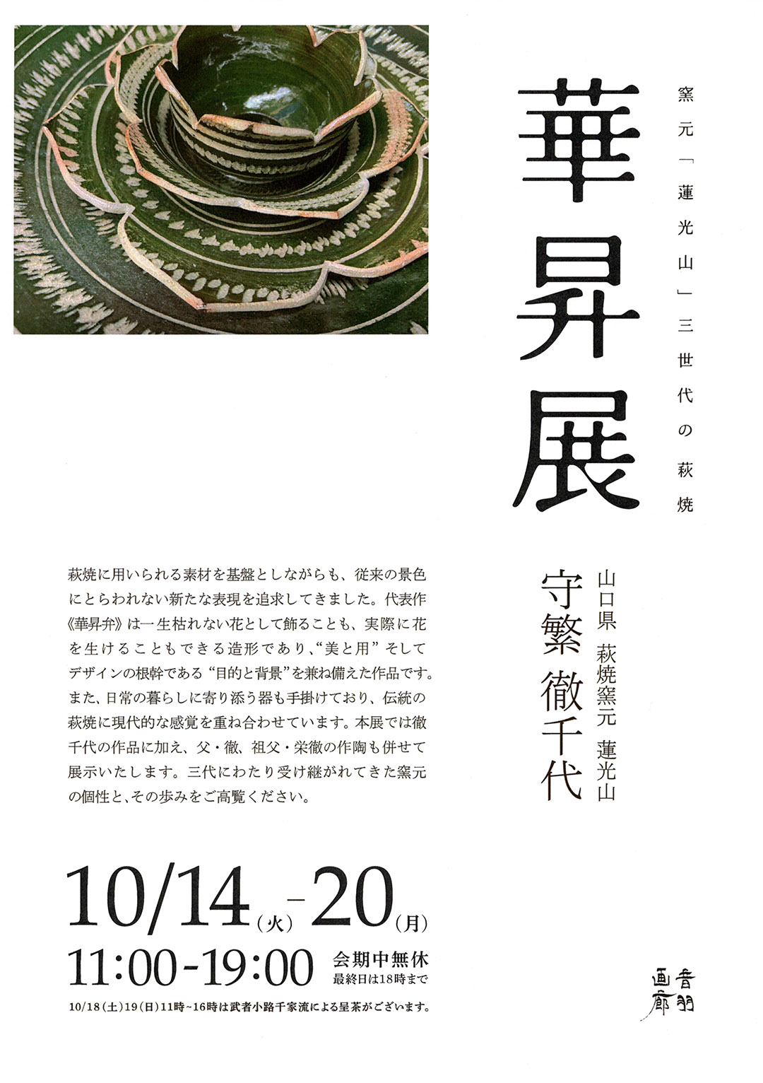 山口県萩焼窯元蓮光山 守繁徹千代氏(工業デザイン学科、105期)の展示会が開催されます。