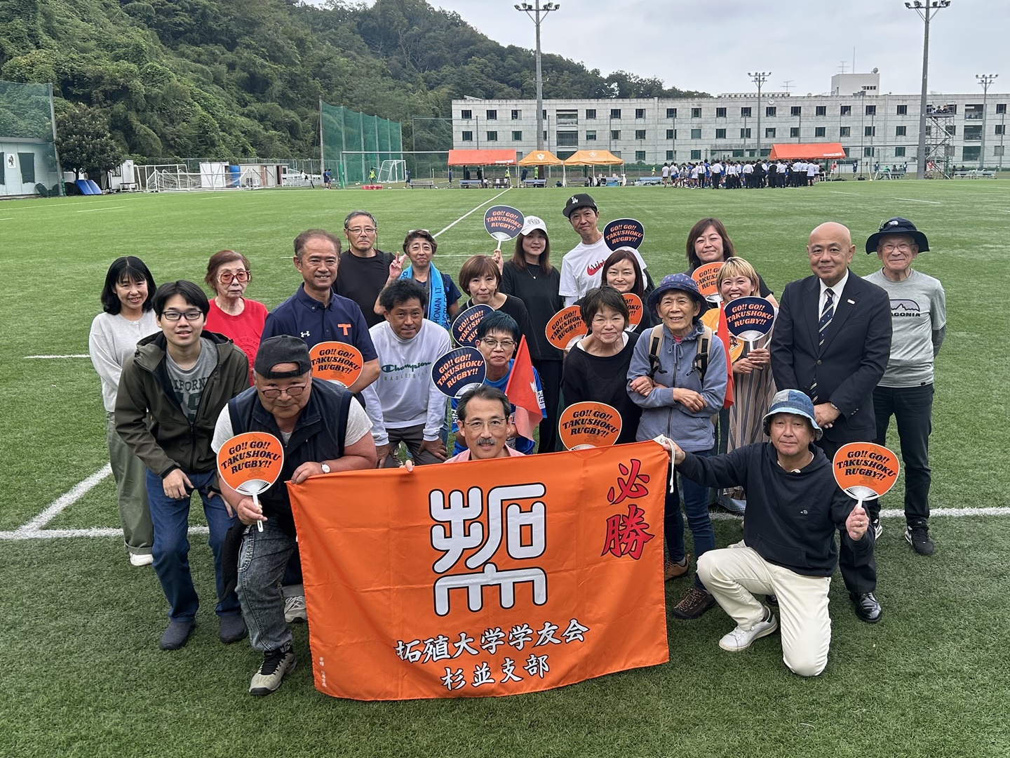10月12日、第4節は今季初めて2部に昇格した新潟食料農業大学に113-21と大差で勝利しました。試合後には応援に駆けつけた北川芳樹 ラグビー部OB会会長、選手のご家族や諸先輩方と拓殖大学の勝利を祝すとともに更なる健闘を願い、杉並支部「応援旗」を掲げ写真を撮りました。